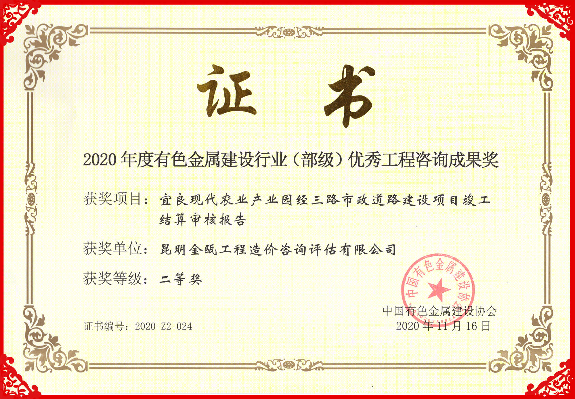 熱烈祝賀昆明金甌工程造價咨詢評估有限公司在2020年度中國有色金屬建設(shè)行業(yè)咨詢成果評獎活動中